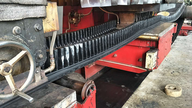 擋邊輸送帶帶體的橫向剛性值是指在帶體的橫向垂直截面內,自由支撐帶體之兩側邊緣,因擋邊輸送帶帶體自重而引起帶體的彎曲下重量與帶體寬度量值之比。高橫向剛性的擋邊輸送帶其橫向剛性值技術標準要求不大于0.05,經對擋邊輸送帶帶體結構優化改進,加設橫向剛性加強層后其橫向剛性檢測值為0.036,帶體承載后橫向變形減小,可使承載能力提高15%~20%。提高大型重載擋邊輸送帶橫向剛性的有效措施是在平基帶體之多層抗拉體帆布層間設置經特殊混煉和壓延的聚酯短纖維專用復合膠層,即聚酯短纖維在膠層內沿帶體橫向單一方向布置埋設的膠層。這種具有使擋邊輸送帶帶體橫向抗彎能力增強的專用復合膠層的使用可使帶體的橫向剛性值較普通結構的擋邊輸送帶提高2.5倍,即使其橫向剛性值由0.09提高到0.036